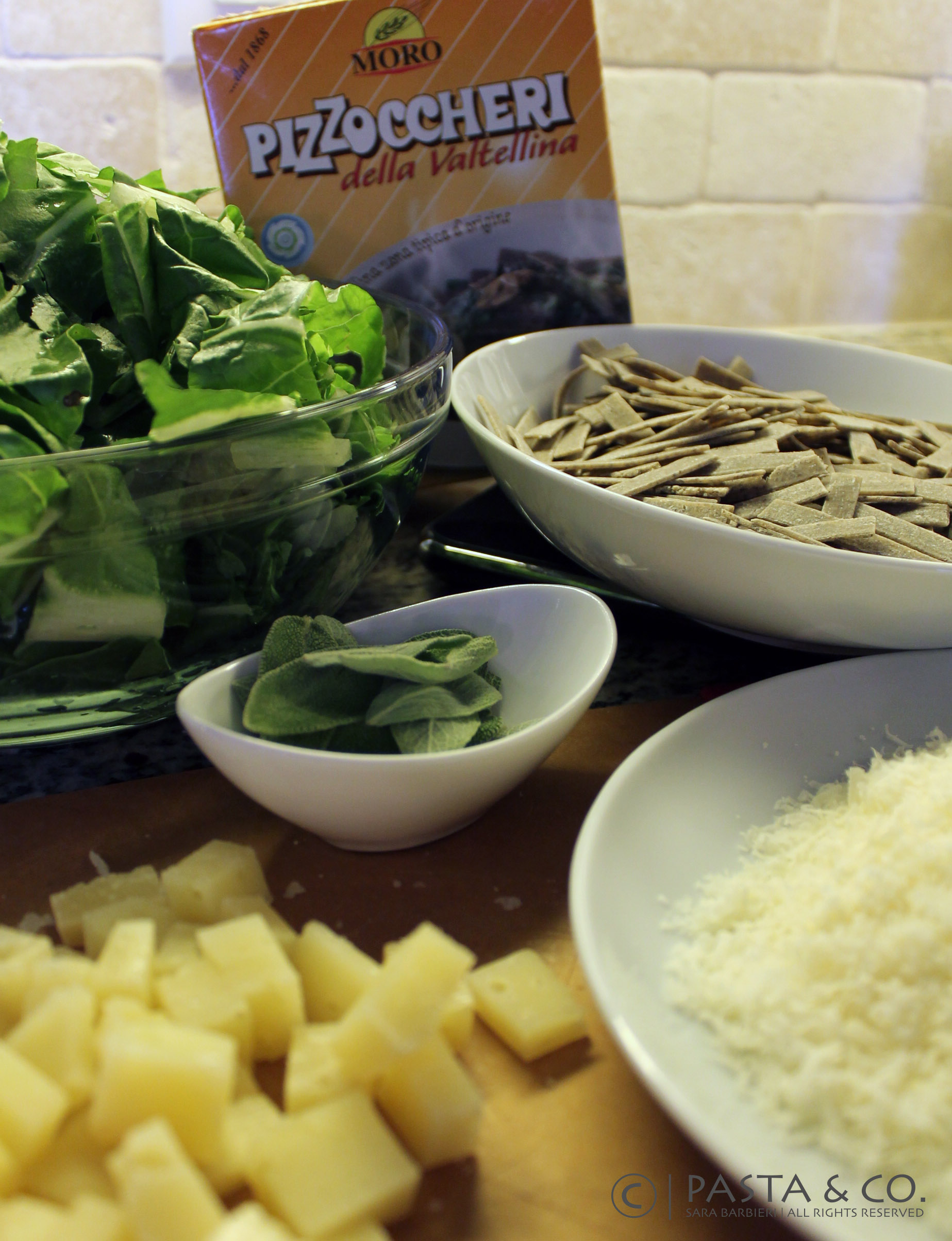 Pizzoccheri are kind of a short tagliatelle pasta, made with a mix of buckwheat and wheat flour. The original recipe calls pizzoccheri to be cooked along with greens (savoy cabbage, swiss chard or bok choy) and cubed potatoes. After 20 minutes of cooking, this mixture is layered with fine sliced or cubed Valtellina Casera and grated Parmigiano and dressed with butter-fried sage and garlic.