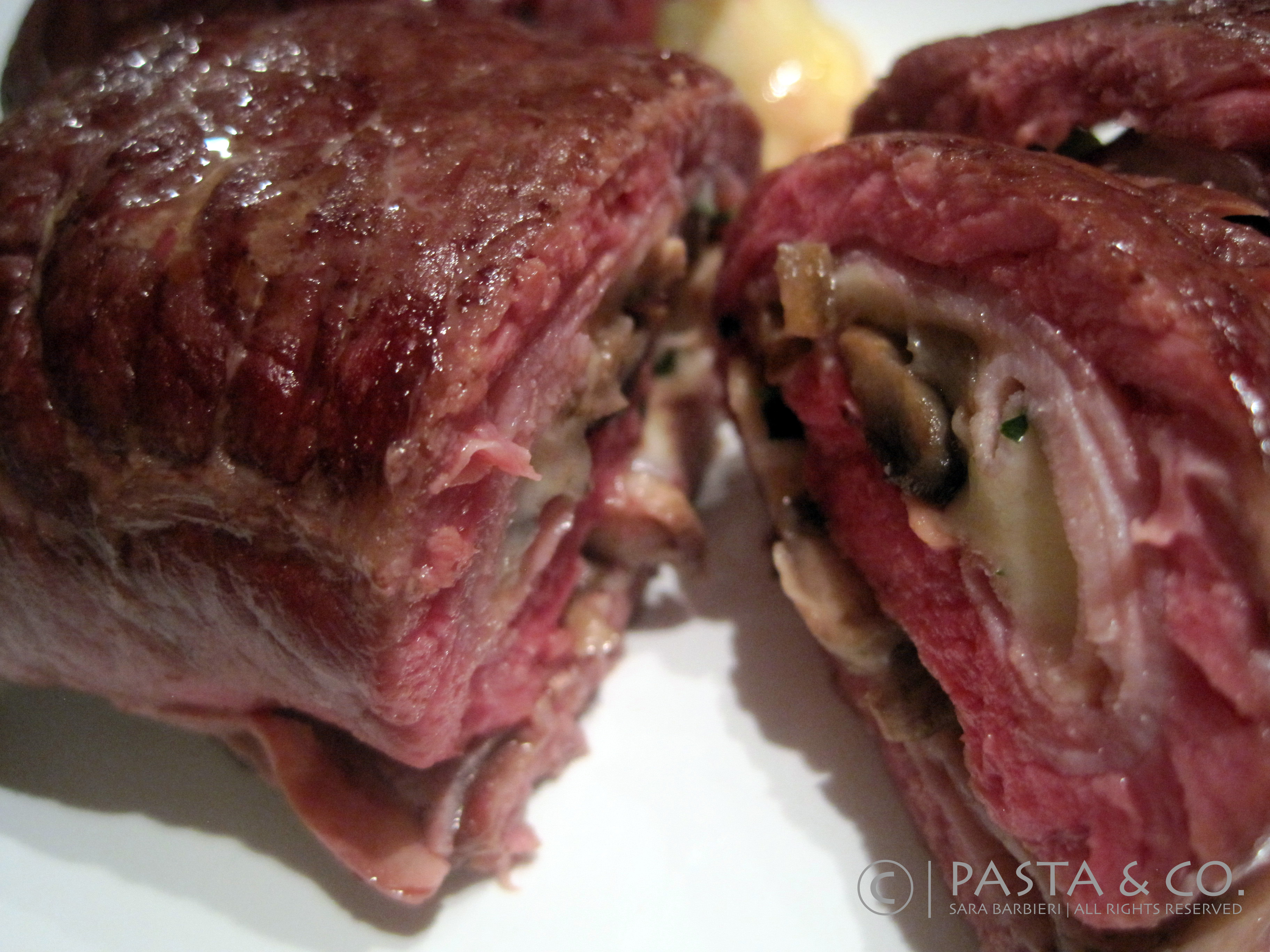 These scaloppini rolls are very easy to make. It’s the perfect said-done recipe for a quick dinner. Yet, it looks great and it makes a great main course paired with a sauteed side dish like spinach, zucchini or even mashed potatoes. ‘Scaloppini’ in Italian is ‘Scaloppine” (p. scalop-pin-eh) as we pronounce the final “e” of words as “eh”. Same goes for fettuccine, linguine, zucchine and so on.