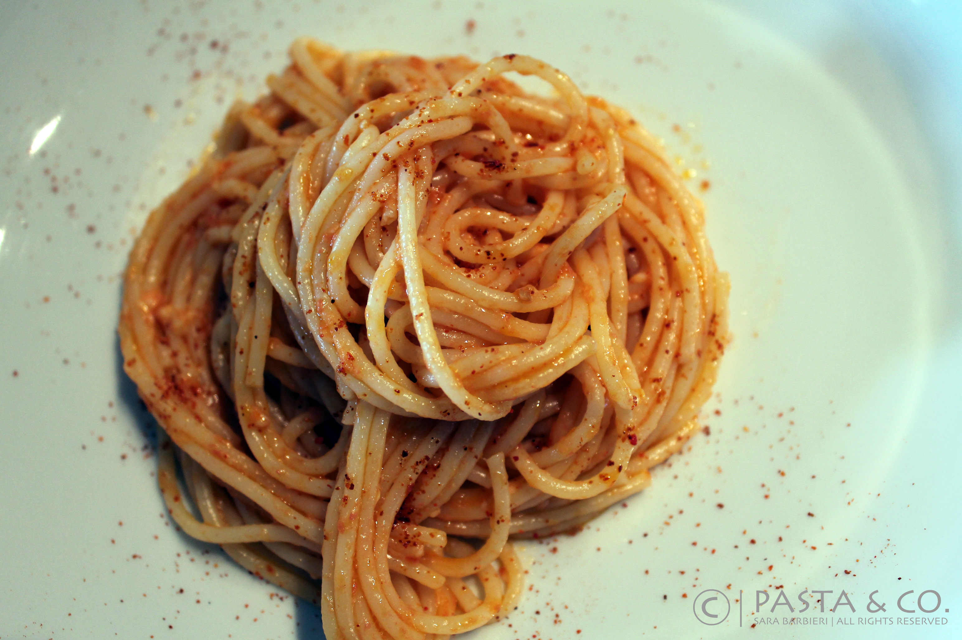 Spa-get-e all-l-yee-o, oll-io eh pep-err-own-chee-no is possibly the simplest and fastest thing you’ll ever make. It turns out to be the saving pasta when you run out of menu ideas and it’s fantastic for a Midnight Spaghettata. The original recipe has only 4 ingredients: pasta, garlic, EVOO, and red hot chili peppers. Mine comes with an emulsion of EVO, chili and a handful of cherry tomatoes. Ci metto un po’ di rossetto – I add some lipstick to it, as my Nonna would say.